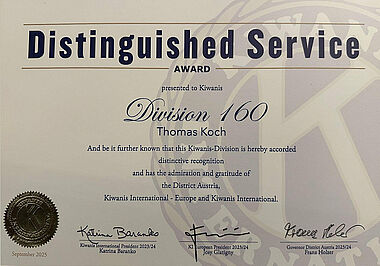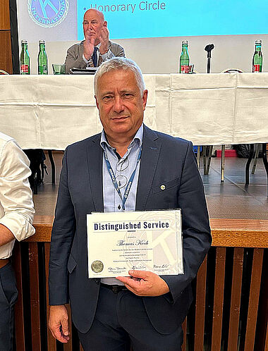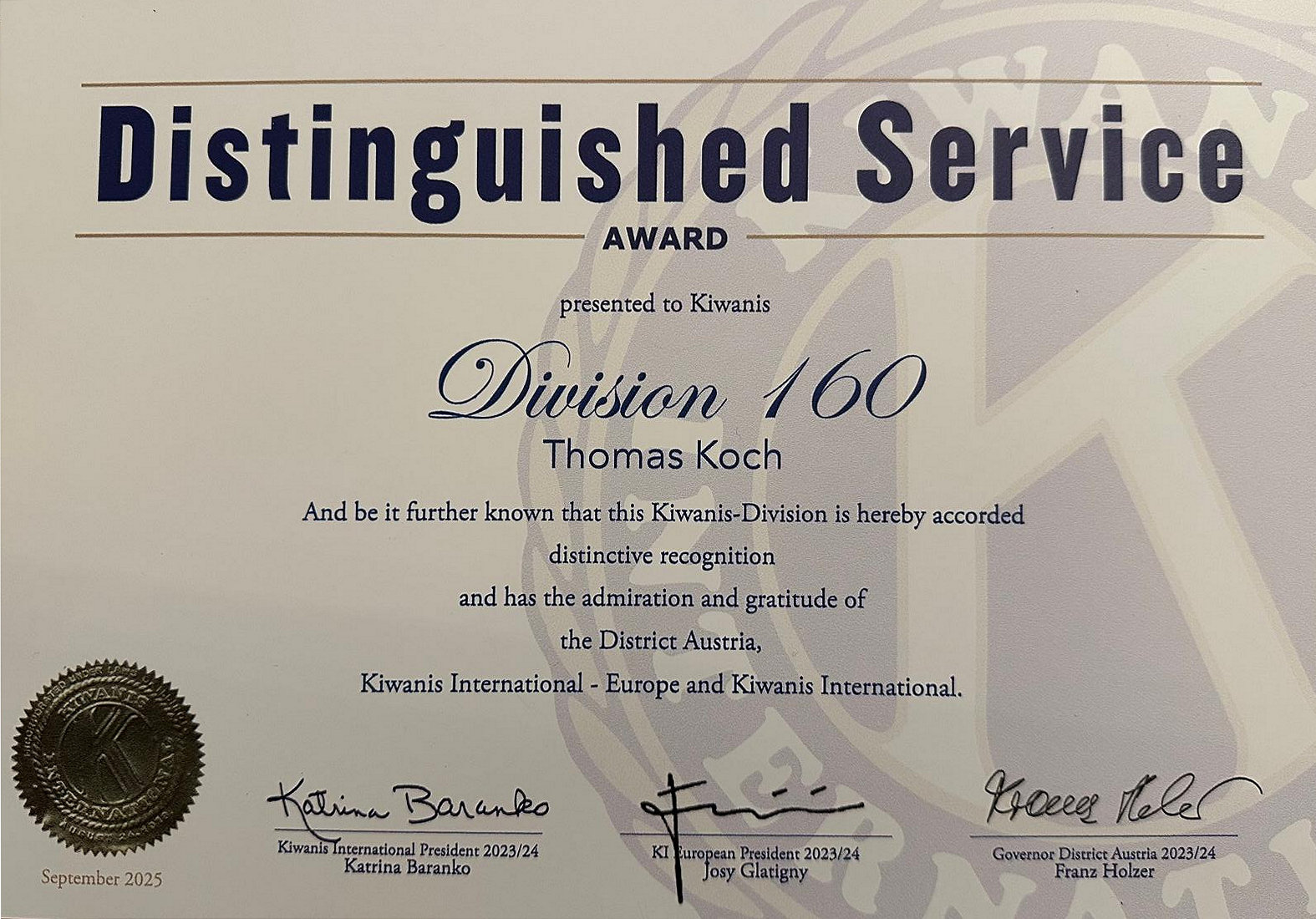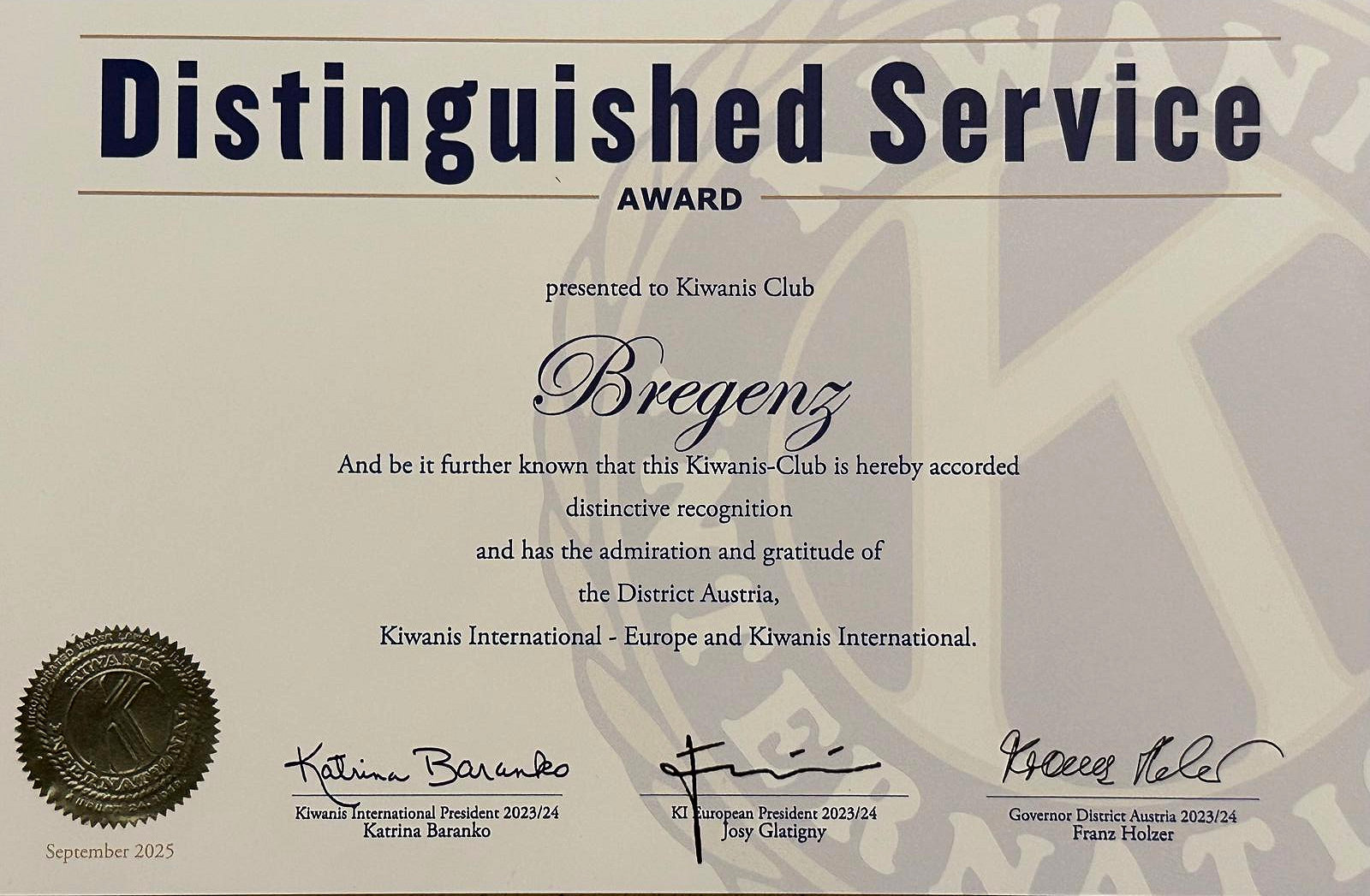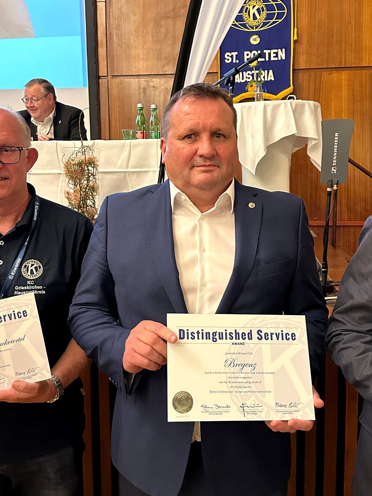 Lt. Governor 2023/24 Thomas Koch durfte die Auszeichnung Distinguished Division in Empfang nehmen. Der Kiwanis Club Bregenz erhielt die Auszeichnung Distinguished Club 2023/24, die an Präsident Hansjörg Gmeiner überreicht wurde.