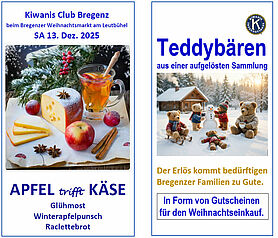 Der Kiwanis Club Bregenz bedankt sich bei der Firma Prinz (Glühmöst, Winterapfelpunsch) und beim Bregenzerwälder Käsehaus (Raclettekäse, Geräte) für das Sponsoring.